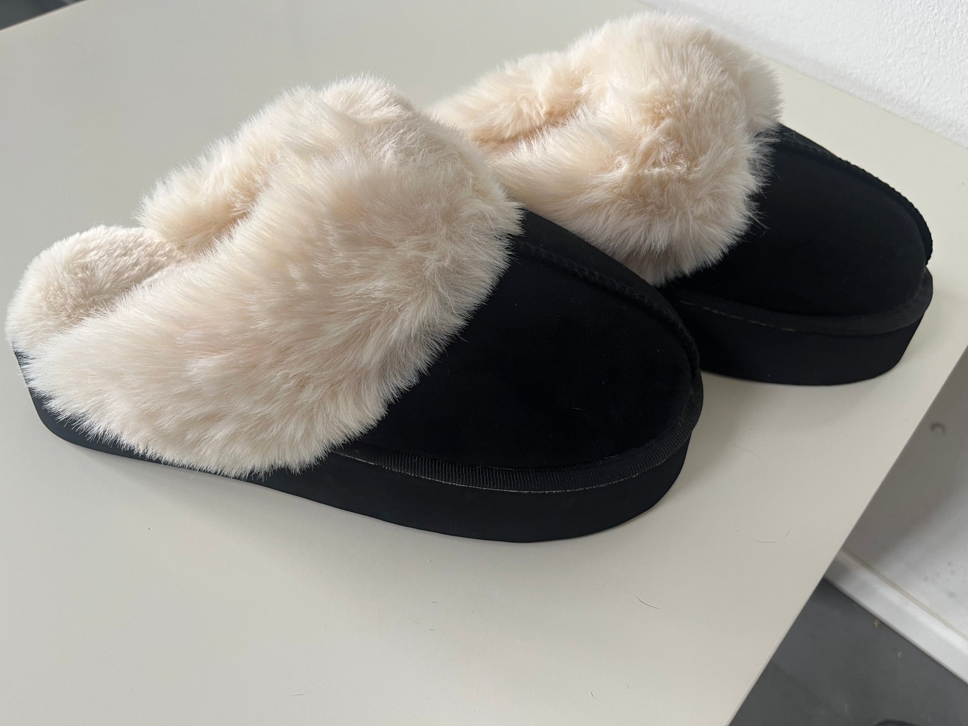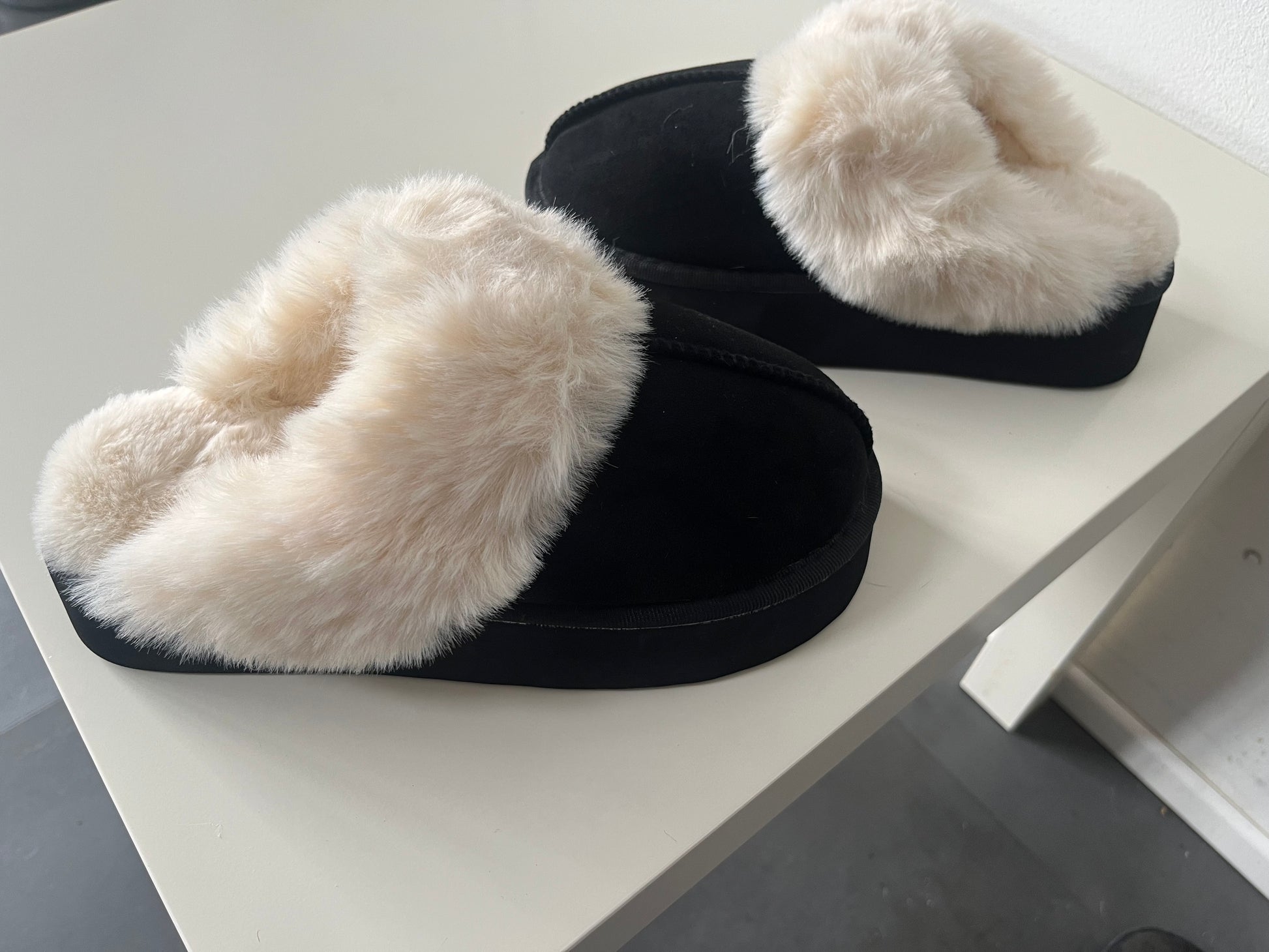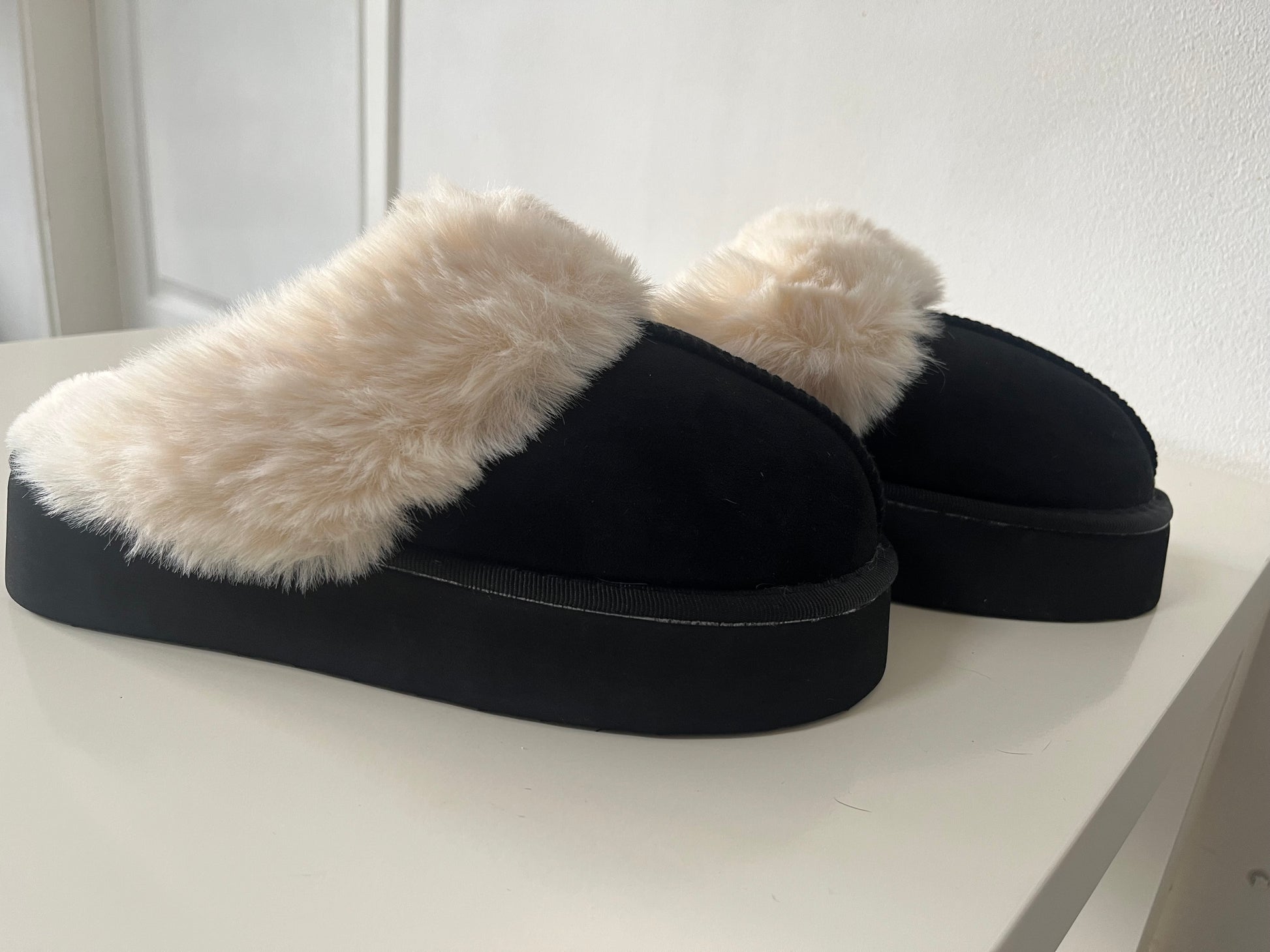 Dankzij de dikke zool loop je comfortabel, terwijl de zachte, witte, fluffy voering je voeten heerlijk warm houdt.